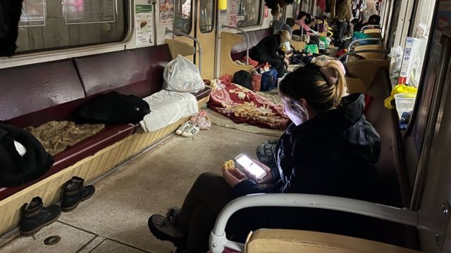 على بعد مسافة قصيرة، انتقل آلاف الأشخاص إلى محطة مترو أنفاق قريبة، حيث كانت أسر بأكملها تعيش على السلالم والأرصفة وداخل عربات القطارات. وكان متطوعون يجلبون الحساء والخبز، وكان الجميع، صغارا وكبارا، يقضون يومهم مفترشين الأرض ومتدثرين بالألحفة.