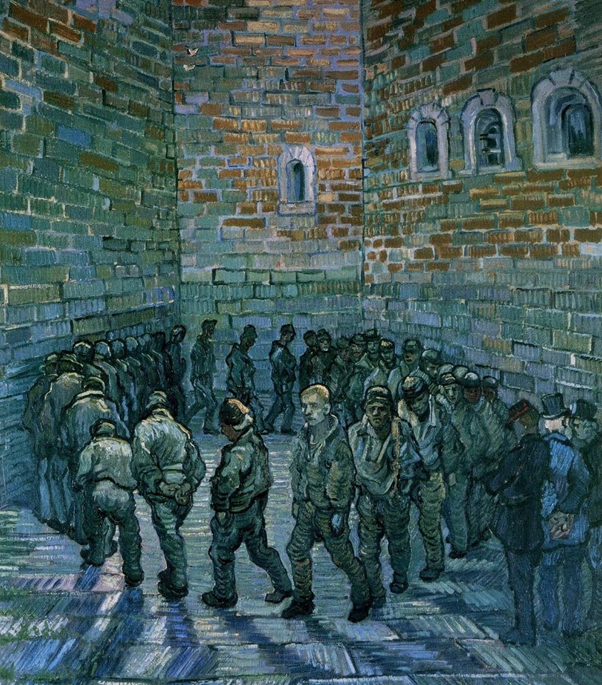 هذه اللوحة التي أحبها نجيب محفوظ تمثل الحالة الإنسانية أصدق تمثيل: الإنسان سجين، يدور في حلقات مفرغة، يراقبه برجوازيون ميسورون يرتدون القبعات العالية ويبرز في هذه اللوحة السجين الذي يتوسطها، والذي رأى فيه النقاد شخصية فان جوخ نفسه، وهو الوحيد الذي لا يرتدي قبعة السجن، ويتطلع أمامه إلى المجهول في ترقب وقلق وحيرة، وتذكرت حيرة كمال عبدالجواد الوجودية، وصيحته المعبرة في "قصر الشوق" أنا الحائر أبدًا، وقد كتب فان جوخ لأخيه ثيو بعد إتمام اللوحة قائلًا: إن كل مايحيط بي ها هنا قد بدأ يثقل علي، لقد قضيت عامًا بحاله في المصح ولا أستطيع الاستمرار، فقد نفد صبري يا أخي ولا أستطيع أن أتحمل المزيد لابد من التغيير، حتى لو كان إلى الأسوأ" وقد قضى فان جوخ على حياته بعد أشهر من رسمه لهذه اللوحة.
