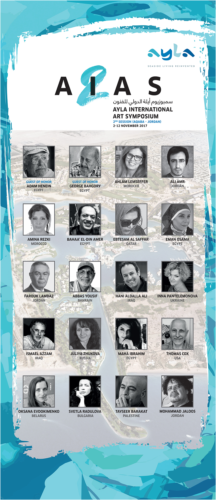 ويشارك في "سمبوزيوم أيلة الدولي" للفنون 20 فناناً هم: من الأردن فاروق لمبز ومحمد الجالوس وعلي عمر، ومن مصر جورج بهجوري ضيف شرف السمبوزيوم والرائد آدم حنين ضيف شرف السمبوزيوم وإيمان أسامة وبهاء عامر ومها إبراهيم من جيل الشباب، ومن المغرب أحلام المسفر وأمينة رزقي، ومن روسيا جوليا زكوفا، ومن أوكرانيا انا بلتيمولوفا، ومن بلغاريا سفيتلا رودولفا، ومن فلسطين تيسير بركات، ومن العراق إسماعيل عزام وهاني دلة، ومن البحرين عباس يوسف، ومن قطر ابتسام الصفار، ومن بيلاروسيا اوكسانا افدوكيمنكو، ومن الولايات المتحدة الأميركية ثوماس كوكس الذي عمل مع العمالقة جاسبر جونز وروبرت روشنبرغ وانجز، بتكليف من الفنانين، مطبوعات مهمة من أعمالهما خلال حياتهما في القرن الماضي.