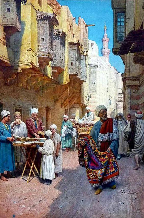 تنتمي لوحة البائع المتجول للسجاد بالقاهره للفنان الايطالى فيليبو بارتولينى الى الفن الاستشراقي وهي لوحه متكاملة في شروطها الفنية تضج باللون وبالروح الشرقيه وبالرغم من منظورها المنحرف لاظهار بائع الخبز وجزء من السوق وجماليات العمارة المصرية القديمه الا ان الرسام ابقى بائع السجاد البطل الرئيس للوحة في اظهار التفاصيل وملامحه في حين اوجد ربطا لونيا ذكيا باللون الازرق في ثلاث مواقع في اللوحة في عباءة البائع والمشتري للخبر والسماء ليكمل مثلت اللوحة .
