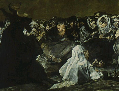 هذا الظلام يحجب مكان الأشخاص المجتمعين. لكن يمكن افتراض أنهم موجودون في مكان منعزل وناء. الوجوه الشوهاء والقبيحة للنساء الحاضرات مع أفواههنّ الفاغرة في رهبة أو خوف هي أيضا من سمات اللوحات السوداء. والملامح الشبحية والعيون الغائرة توحي بأن ما يجمع هؤلاء الأشخاص هنا هو أمر له علاقة بالحداد أو الموت.
