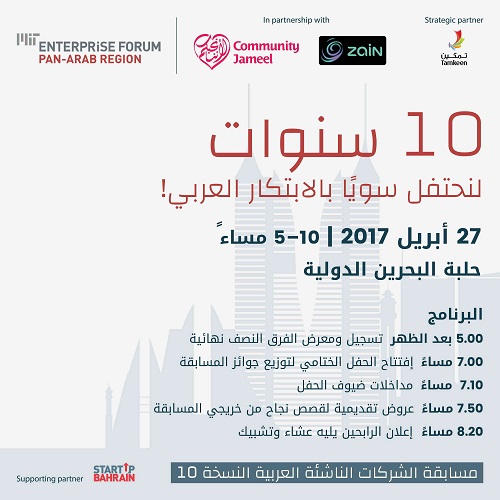 البحرين - بيروت- جدّة- الكويت -19 نيسان 2017: تتوجه الأنظار الى البحرين التي تستضيف في السابع والعشرين من نيسان الحفل الختامي لمسابقة MIT لأفضل الشركات العربية الناشئة في نسختها العاشرة، الذي ينظمه منتدى MIT لريادة الأعمال في العالم العربي بالشراكة مع "مجتمع جميل" المؤسسة الاجتماعية التي تدير العديد من المبادرات من أجل إحداث تغيير إيجابي في المجتمع وتحقيق الاستدامة الاقتصادية، ومجموعة "زين"، الشركة الرائدة في مجال الاتصالات المتنقلة في منطقة الشرق الأوسط وإفريقيا، ومع الشريك الاستراتيجي لهذا العام "تمكين" البحرين، وهي هيئة شبه حكومية تعنى بجعل القطاع الخاص في البحرين المحرك الرئيسي للنمو الاقتصادي المستدام في المملكة.