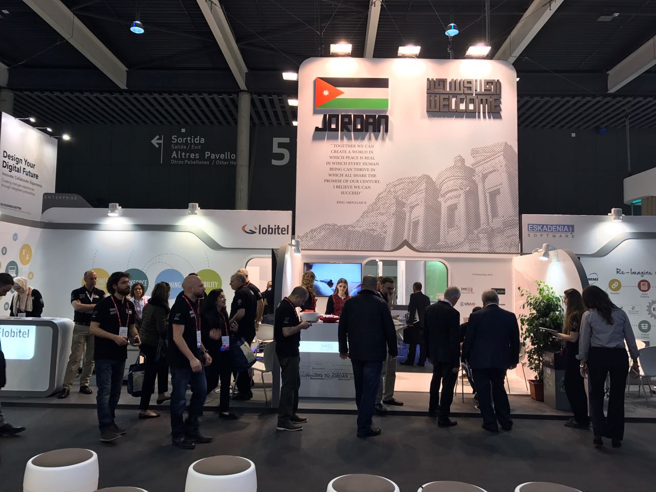 ويستمر المؤتمر الذي انعقد اليوم حتى 2 اذار، ويشارك به من خلال الجناح الأردني 18 شركة أردنية في قطاع تكنولوجيا المعلومات، حيث حظي الجناح الأردني باهتمام كبير، وقد قامت وزيرة الاتصالات وتكنولوجيا المعلومات ووزيرة تطوير القطاع العام مجد شويكة بزيارته، بالإضافة إلى الرئيس التنفيذي ورئيس مجلس مفوضين هيئة تنظيم قطاع الاتصالات الدكتور المهندس غازي الجبور، حيث تجولا في الجناح برفقة الرئيس التنفيذي لشركة زين الأردن أحمد الهناندة، الذي قدّم شرحاً موجزاً عن دور زين في دعم هذا الجناح الذي يمثّل خطوة هامة في تعزيز المشاركة الأردنية في الفعاليات العالمية، بالإضافة إلى ترسيخ مكانة المملكة كمركز إقليمي للاتصالات وتكنولوجيا المعلومات.