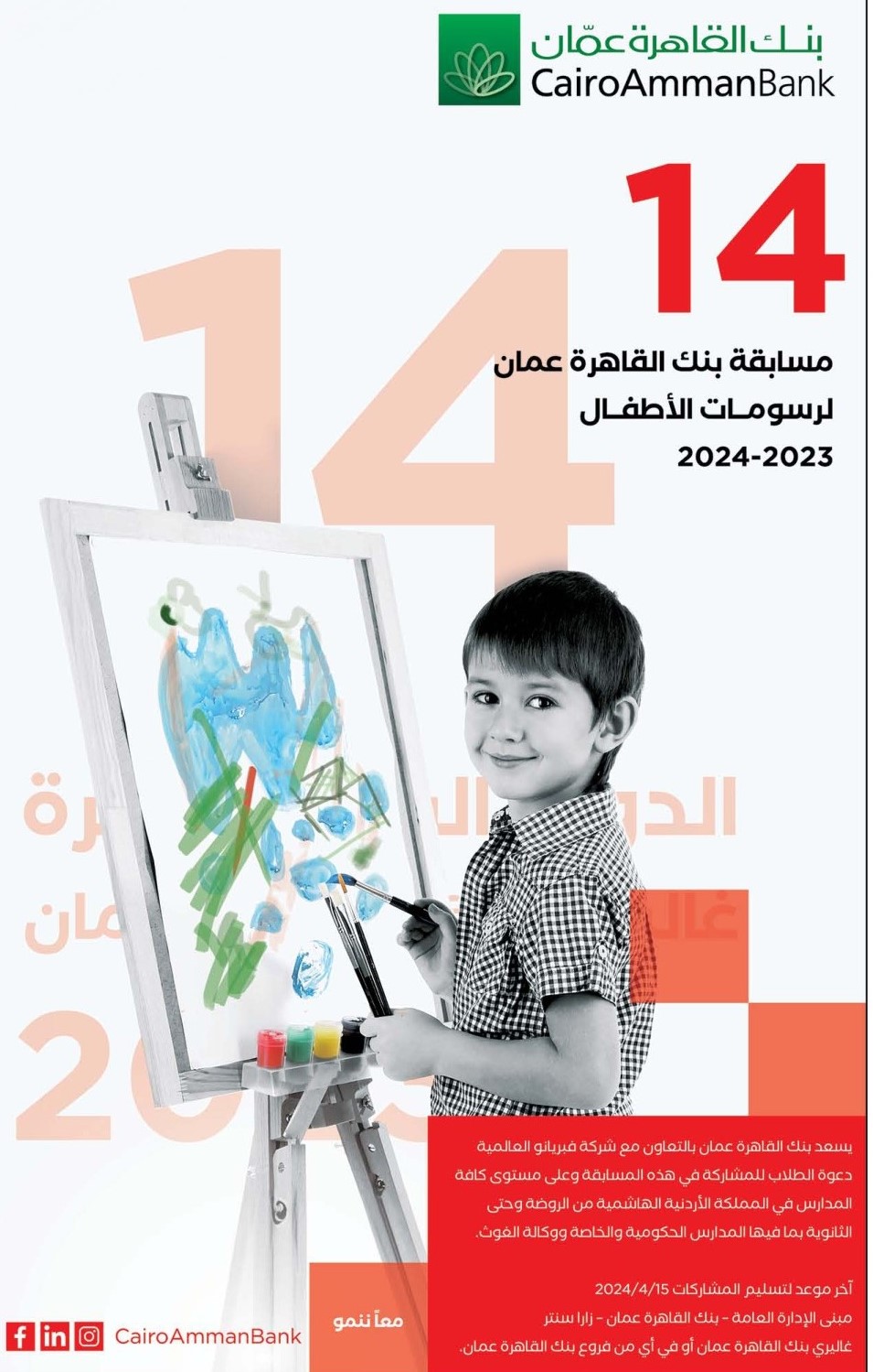 شو في نيوز   - أعلن جاليري بنك القاهرة عمان عن الموعد النهائي اللدورة الرابعة عشر لمسابقة رسوم الأطفال السنوية وهي تاتي بالتعاون مع فبريانو الاردن وبحسب شروط المسابقة فهي مفتوحة لكافة الطلاب في المملكة وفق الشروط وعلى رأسها موضوعات المسابقة وهي؛ البيئة التي يعيش فيها الطالب، والاعتزاز بالوطن والهوية، والحياة اليومية، القدس في عيون أطفالنا، كما وجاءت من ضمن الشروط؛ المواد والخامات؛ على أن تكون من الألوان المائية والخشبية والزيتية، والجرافيك وفن البوستر، خامات فنية مختلفة.
