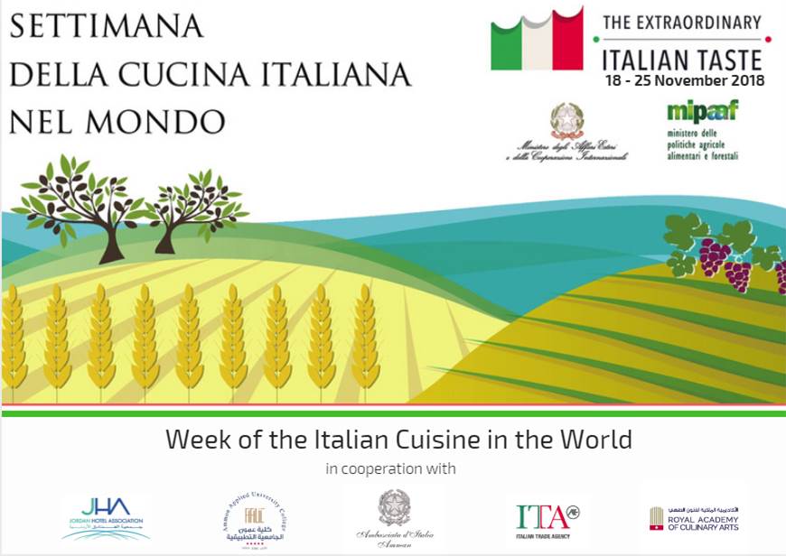 عمان - شووفي نيوز - يعود أسبوع المطبخ الإيطالي في الأردن اعتبارا من 19 ولغاية 25 تشرين الثاني2018.السفارة الايطالة في عمان تكشف عن الجدول الزمنيللفعاليات التي تنظمها بالتعاون مع البعثة التجارية الايطالية في عمان، وجمعية الفنادق الأردنية،وكلية عمون الجامعية التطبيقية (AAUC)والأكاديمية الملكية لفنون الطهي.