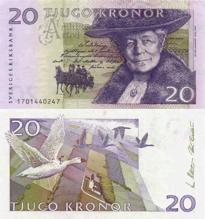 استكهولم - الصورة هي ورقة نقدية لدولة السويد بقيمة (20) كرونا، كما لاحظتم على إحدى وجوهها صورة لسيدة هذه السيدة هي الكاتبه السويدية سيلمى ليكروف الحائزة على جائزة نوبل للأدب سنة (1909)