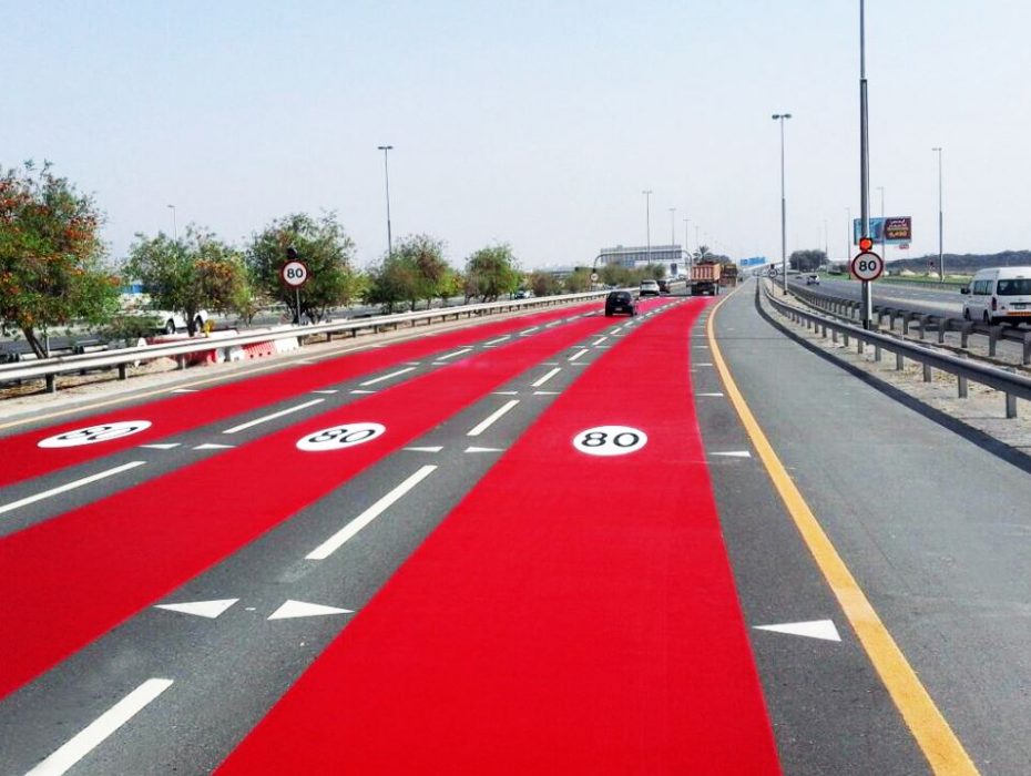 وأوضحت المهندسة ميثاء بن عدي المدير التنفيذي لمؤسسة المرور والطرق في الهيئة أنه تم تنفيذ التجربة في موقع معين مبدئياً على شارع عود ميثاء “قرب تقاطع بوكدرة” على امتداد شارع دبي والعين بحيث تشمل المسارب كافة بشكل يلفت انتباه مستخدمي الطريق كوسيلة تنبيهية للالتزام بسرعة الشارع المقررة وأنه سيتم تطبيق مراحل استخدام الأصباغ الملونة في مناطق تغيير السرعة على بعض الطرق الحيوية الأخرى في إمارة دبي وفق برنامج زمني تدريجي بهدف اعتياد السائقين عليها حرصاً على سلامتهم وتفادياً للمخالفات والحوادث الناتجة عن السرعة الزائدة وفقاً لرؤية الهيئة المتمثلة بـ “تنقل آمن وسهل للجميع”.