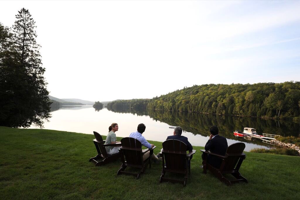 وتظهر في الصورة جلسة مميزة لرئيس الوزراء الكندي وضيوفه على ضفاف بحيرة، وسط الطبيعة الخلابة، دون الإشارة إلى اسم المنطقة.