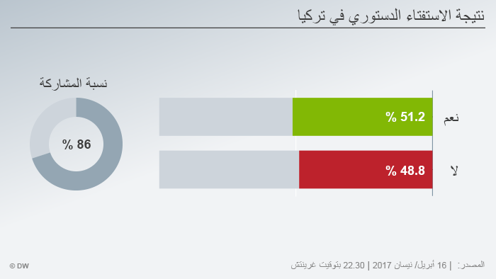 وفي سياق متصل بنتائج إستفتاء تركيا، أعلنت وكالة الأناضول الرسمية التركية أن غالبية كبيرة من الأتراك المقيمين في ألمانيا، أيدت التعديلات الدستورية الرامية إلى تغيير النظام الرئاسي. وجاء في تقرير للوكالة التركية مساء الأحد، أن 63,1 في المائة من أتراك ألمانيا صوتوا لصالح معسكر "نعم" المؤيد للرئيس التركي رجب طيب أردوغان، فيما بلغت نسبة مؤيدي معسكر "لا" 36.8 في المائة، واقتربت نسبة المشاركة في التصويت في الاستفتاء في ألمانيا من 50 في المائة.