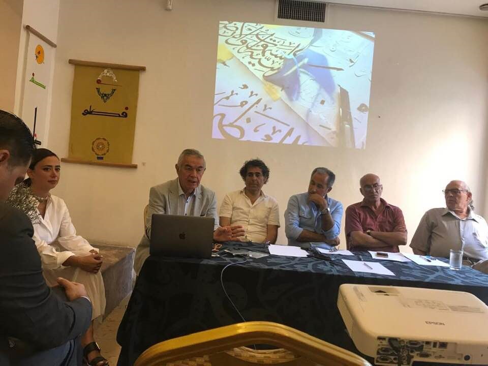 وأشار لمبز لانتقالته من اللوحة التقليدية الواقعية إلى الحروفية، مستفيدا من خبرته الجرافيكية، شارحا معالجاته ووأسلوبه وتقنياته التي يستعملها لاشتغال العمل الفني.