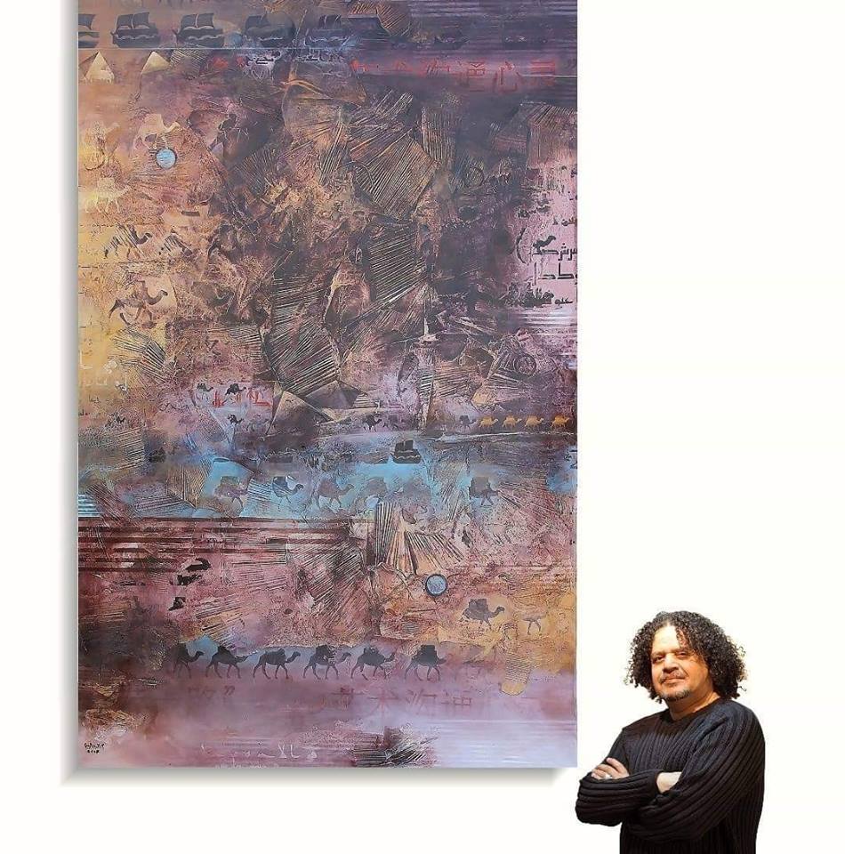 واضاف الجالوس بان لوحته تحمل عنوان طريق الحرير ومادة اللوحة الوان اكريلك ومواد مختلفة على كانفس وحجم اللوحة : ثلاثه متر ونصف المتر في مترين .