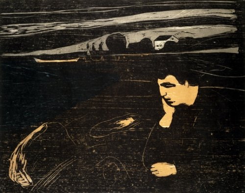 في هذه اللوحة يرسم الفنّان صديقه الكاتب النرويجي ياب نيلسن وهو يجلس على شاطئ، منعزل ومقفر بينما هو مستغرق في تفكير عميق. كتفاه محنيّان وتعابيره قاتمة. الألوان الأسود والأصفر والرمادي تمنح إحساسا عن طبيعة هي نفسها مظلمة. نيلسن كان في ذلك الوقت يعاني من أزمة عاطفية مستحكمة. ومونك يُظهر لنا في اللوحة قلق صديقه الذي هو جزء من حالة الإنسان في العالم المعاصر.