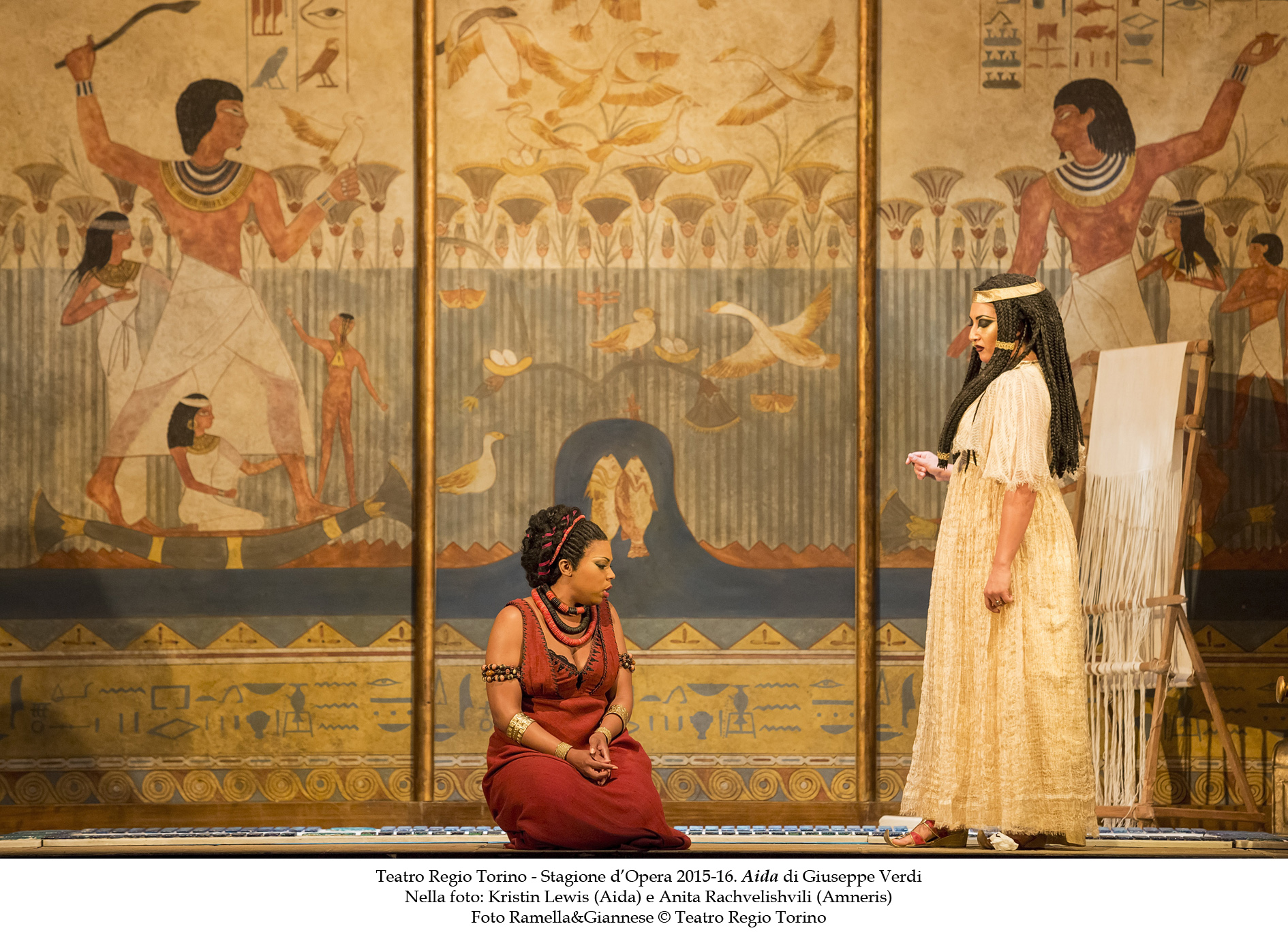 وفي هذا الإنتاج المتميز لفرقة الأوبرا الإيطالية المرموقة لمسرح "تياترو ريجيو" في تورينو، فإن هذه الأوبرا المذهلة ستنبض بالحياة، مع وجود عدد من أفضل المؤدّين المنفردين في العالم. حيث سيكون دور عايدة من نصيب السوبرانو الأمريكية الحائزة على العديد من الجوائز، "كريستين لويس"، المتخصصة تقريبًا في أدوار البطلات في أعمال فيردي. أما " غريغوري كوندي" الذي يعتبر أحد أكثر أشهر مغني التينور على المسرح الدولي اليوم، فسوف يبهر الجمهور دون شك بأدائه المفعم، والقوي لدور راداميس. أما دور الأميرة "أمنيريس"، فتؤديه الميزو سوبرانو الجورجية "أنيتا راشفيليشفيلي"، التي كان أوّل ظهور عالمي لها على خشبة مسرح "لاسكالا" في عام 2010، حين أدّت دور البطولة في أوبرا "كارمن"، إلى جانب التينور الشهير عالميًا، يوناس كاوفمان. أما دور الملك "أموناسرو" فسوف يقوم بأدائه الباريتون "أمبروجيو مايستري"، الذي انطلقت نجوميته بعد أدائه الأول لدور "فالستاف" تحت قيادة واحد من ألمع قادة الأوركسترا، ريكاردو موتي، لتنهال عليه الدعوات بعدها للوقوف على خشبة أرقى المسارح العالمية.