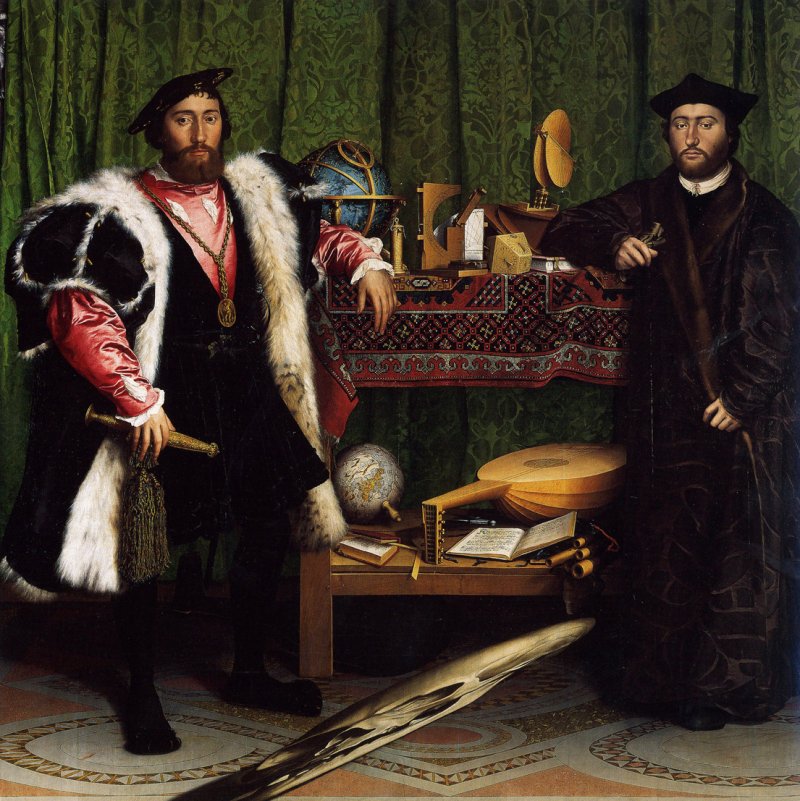 العناصر والأشياء التي تزدحم بها اللوحة كلّها ممّا يسترعي الاهتمام. سطح الطاولة العلوي مغطّى بسجّاد شرقي رُسمت خيوطه ببراعة نادرة. وعلى الطاولة أيضا أدوات رياضية وفلكية متعدّدة. يمكن أيضا رؤية آلة لتحديد الوقت وإسطرلاب وكرة تمثّل الأرض. وعلى الجزء السفلي من الطاولة نرى كتابين وكرة أخرى مجسّمة للأرض وآلات هندسية بالإضافة إلى آلة عود "أو لوت" بوتر مقطوع. الموزاييك على الأرضية يشبه ذلك الذي تُفرش به أرضيّات الكنائس. هناك أيضا الخلفية ذات الحرير الأخضر. وفي أقصى الزاوية العلوية اليسرى يظهر تمثال فضّي صغير يصوّر حادثة الصلب.