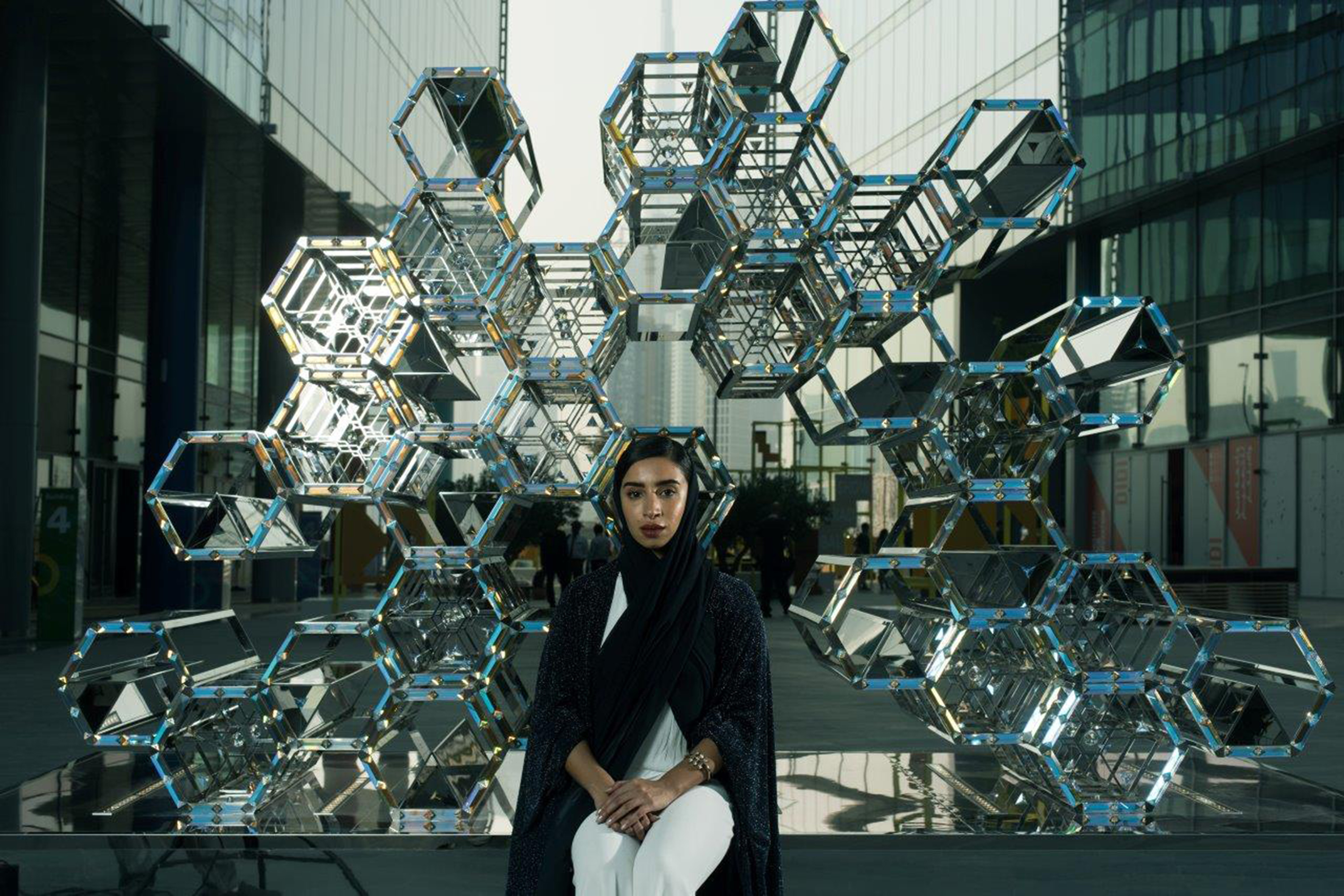 والعمل التركيبي لزينب لهاشمي ضمن حي دبي للتصميم محاطٌ بمبانٍ فولاذية وزجاجية شاهقة، ويتألف من 33 قطعة سداسية الشكل مصنعة من الفولاذ العاكس ومزينة بـ 1145 قطعة كريستال من سواروفسكي ومواشير عاكسة. ويبرز العمل أفقياً، ويبلغ ارتفاعه 1.5 متر وعرضه 3 متر، وتُظهر قطعه سلسلة لا متناهية من المشاهد المتلونة حيث تعكس وتكسر قطع الكريستال الضوء متعدد الألوان. وسيجد الزوار أنفسهم أمام سرابات هندسية برَّاقة تشدهم للتفاعل مع الانعكاسات المختلفة واستكشاف العلاقة بين كل قطعة وأخرى والعالم من حولهم.