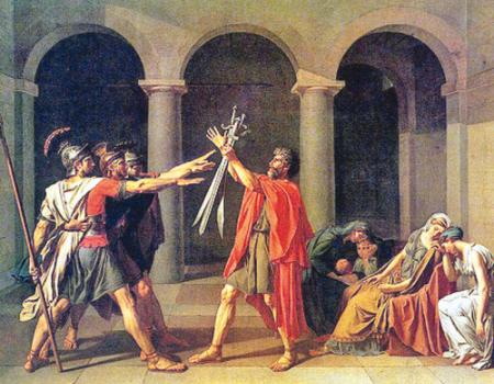 نظرات الإخوة الثلاثة تبدو مصمّمة وأيديهم ممتدّة بصلابة بينما يعلنون ولاءهم لروما ويقسمون على التضحية بحياتهم من أجل الواجب الوطني.