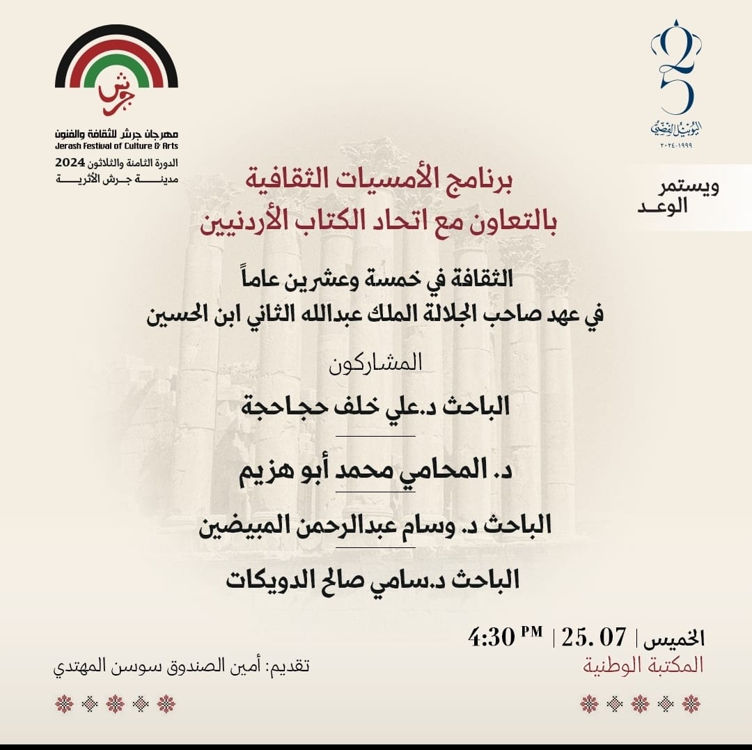 شو في نيوز - ضمن فعاليات مهرجان جرش يقيم اتحاد الكتاب الاردنيين امسيته الثقافية في 25 عاما  في عهد صاحب الجلالة الملك عبدالله بن الحسين مساء اليوم الخميس في المكتبة الوطنية  في الرابعة والنصف