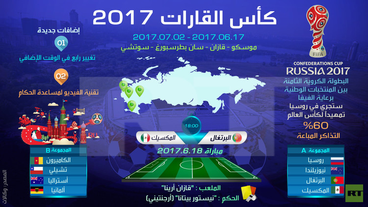قازان - يحتضن ملعب "قازان أرينا" بتتارستان ، يوم غد الأحد، مباراة من العيار الثقيل، بين منتخبي البرتغال والمكسيك، ضمن بطولة كأس القارات 2017 لكرة القدم، التي انطلقت اليوم في سان بطرسبورغ.