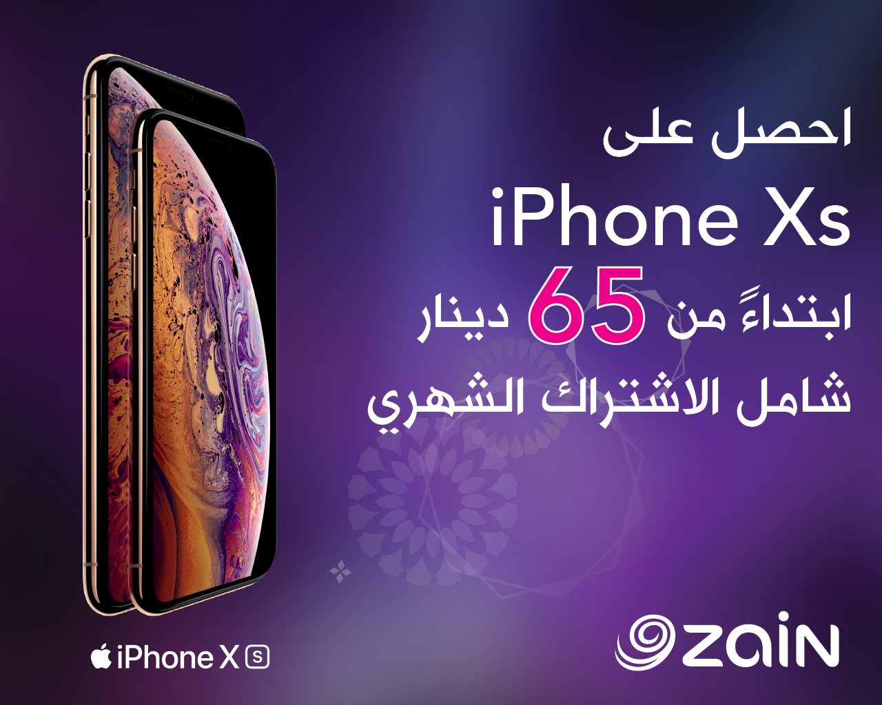 إذ تبدأ الإشتراكات الشهرية الخاصة بجهاز iPhone Xsمن 65 دينار لتشمل سعر الجهاز وباقة توفر دقائق غير محدودة غلى شبكة زين و1750 دقيقة على الشبكات الأُخرى و75 دقيقة إتصال دولية لأكثر من 60 دولة، بالإضافة إلى سعة إنترنت تتيح 40 جيجابايت مقسمة لـ 39 جيجابايت تستعمل محلياً و1 جيجابايت تستخدم أثناء التجوال الدولي، ويوفر العرض 1750 رسالة محلية قصيرة، كما يقدم العرض عدة ميزات إضافية منها استقبال المكالمات أثناء التجوال بعشرة قروش للدقيقة وخدمة إخفاء الرقم وخدمة CLI+ لمعرفة المكالمات الواردة في حالة إغلاق الخط، كما سيتمكن المشترك من الدخول إلى قاعة زين لكبار العملاء في مطار الملكة علياء الدولي والإستفادة من الخدمات المتميزة فيها.